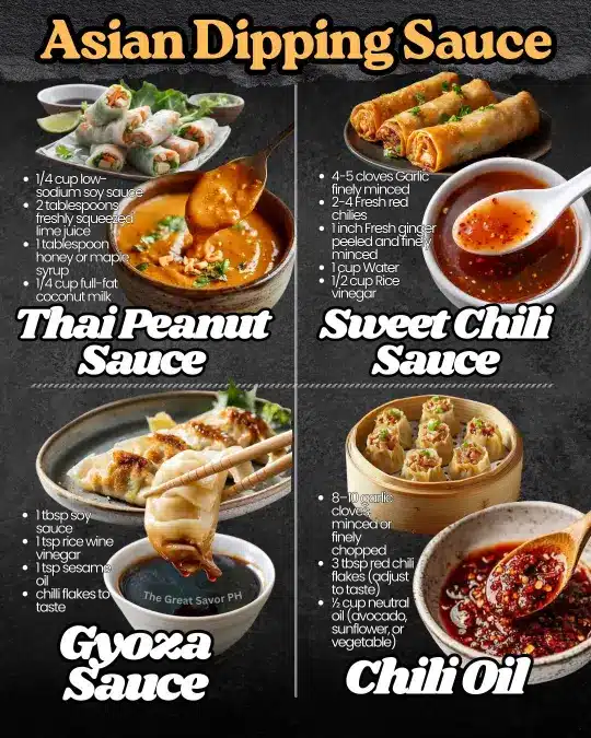 These easy Asian dipping sauce recipes are perfect for dumplings, spring rolls, noodles, and appetizers. Learn how to make Thai peanut sauce, sweet chili sauce, classic gyoza dipping sauce, and homemade chili oil using simple ingredients. These flavorful sauces are great for meal prep, party platters, or adding bold Asian-inspired flavor to your favorite dishes. Save this for quick sauce ideas, homemade condiments, and Asian cooking inspiration.