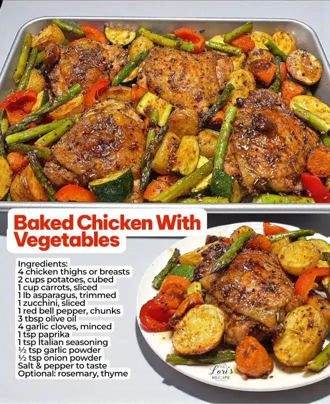 This baked chicken and vegetables recipe is the perfect solution for a busy weeknight dinner. It’s a complete meal cooked on a single pan, minimizing cleanup while maximizing flavor. The chicken is seasoned with a savory blend of herbs and spices, and the vegetables are tender and slightly caramelized. It’s a healthy, delicious, and customizable dish that the whole family will enjoy.