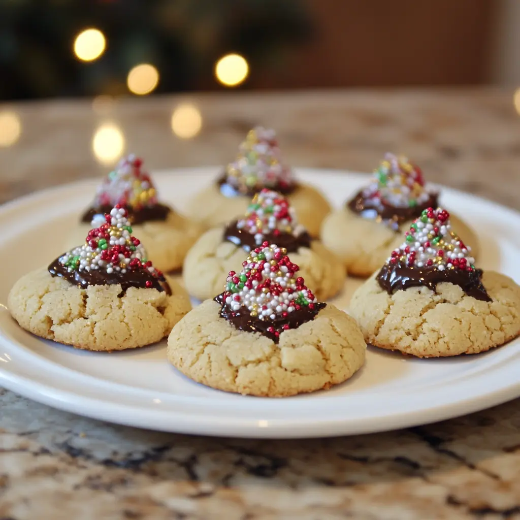 Step 5: Bake in the preheated oven for 10 to 12 minutes, or until the edges turn light golden brown. As soon as you take them out, press a chocolate kiss gently into the center of each cookie.