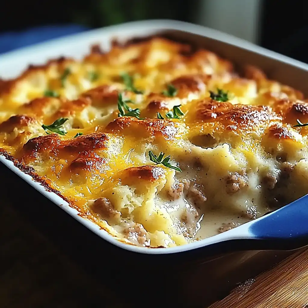 This hearty breakfast casserole combines the comfort of biscuits and gravy with the crispy goodness of hashbrowns, all baked together with eggs and cheese for a satisfying morning meal.