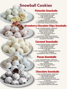 Delicious homemade Snowball Cookies in five irresistible flavors: Pistachio Snowballs, Strawberry Chocolate Chip Snowballs, Coconut Snowballs, Pecan Snowballs, and Chocolate …