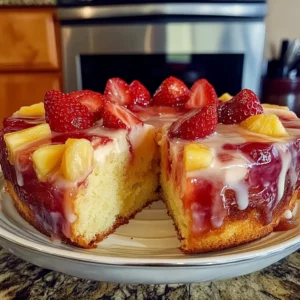 Short Description A delightful and moist pound cake featuring layers of fresh strawberries and tangy pineapple, topped with a sweet …