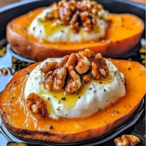 Description: Sweet potatoes roasted to golden perfection, drizzled with a tangy-sweet maple Dijon sauce, topped with creamy burrata and crunchy …