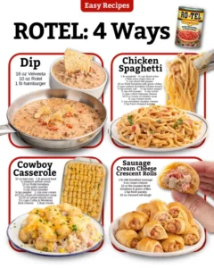Looking for easy Rotel recipes everyone will love? This Rotel: 4 Ways recipe collection features creamy Rotel dip, cheesy chicken spaghetti, cowboy casserole with tater tots, and sausage …
