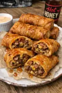 Description These Hot Honey Bacon Cheeseburger Stuffed Egg Rolls take the classic American comfort food and give it a fun, …