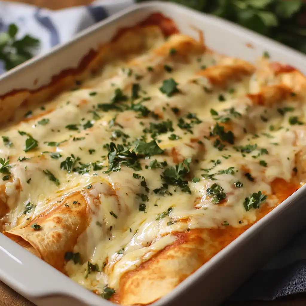 Tender shredded chicken wrapped in tortillas, topped with a homemade creamy sauce, and baked with melty cheese — a true comfort-food favorite.