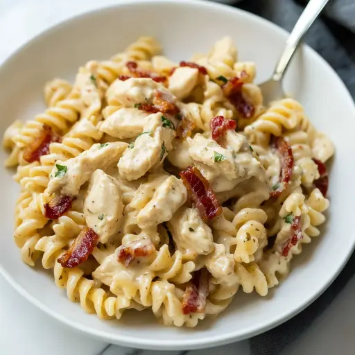 Serve the Chicken Bacon Ranch Pasta immediately, garnished with the reserved crispy bacon.