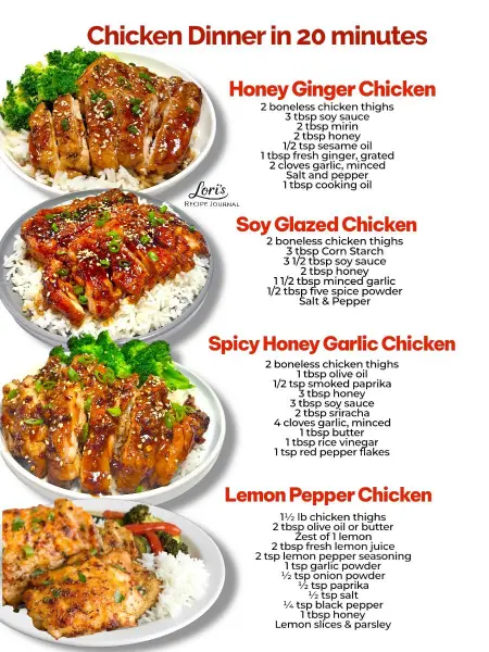 Need a fast, flavorful dinner? These 20-minute chicken dinner recipes are perfect for busy weeknights! Featuring honey ginger chicken, soy glazed chicken, spicy honey garlic chicken, and lemon pepper chicken, this lineup delivers big flavor with simple ingredients. Quick to cook, family-friendly, and better than takeout—save this pin for easy chicken dinners, meal prep ideas, and quick healthy meals.