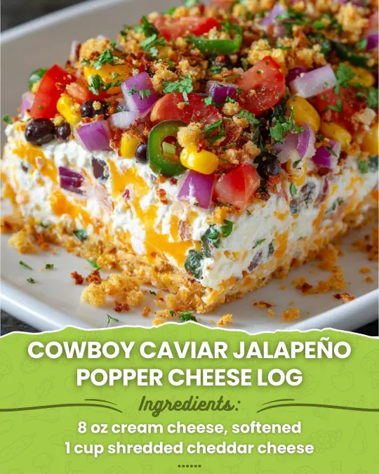 Bold and irresistible Cowboy Caviar Jalapeño Popper Cheese Log loaded with creamy cheese, fresh veggies, black beans, corn, jalapeños, and crispy topping. This easy no-bake appetizer is perfect for parties, game day, potlucks, and holiday gatherings. Packed with spicy, cheesy, and crunchy flavors, it’s a crowd-pleasing dip served with crackers or chips. Quick to make, colorful, and totally addictive—perfect appetizer inspiration!