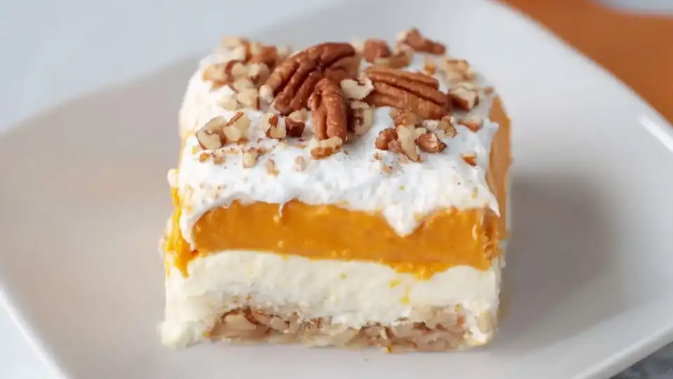 Step 1: Prep the base: Lightly grease an 8×8-inch baking dish. You can use cooking spray or butter. Step 2: Make the crust: In a medium bowl, combine the flour, softened butter, and chopped nuts. Use a pastry blender or your fingers to work the butter into the flour until the mixture resembles coarse crumbs. Step 3: Press the base: Press the crust mixture evenly into the prepared baking dish. Ensure it covers the entire bottom of the dish for a solid base. Step 4: Cheesecake layer: In a large bowl, beat the softened cream cheese with the powdered sugar until smooth and fluffy. This is best done with an electric mixer to ensure there are no lumps. Step 5: Fold in whipped topping: Gently fold in 1 cup of the thawed whipped topping into the cream cheese mixture until well combined. Be careful not to overmix, as this can deflate the whipped topping. Step 6: Chill cheesecake layer: Spread the cheesecake layer evenly over the cooled crust in the baking dish. Place the dish in the refrigerator to chill while you prepare the pumpkin pudding layer. Step 7: Pumpkin pudding: In a separate large bowl, whisk together the milk and vanilla instant pudding mixes until the mixture begins to thicken slightly. Step 8: Combine pumpkin and cinnamon: Stir in the canned pumpkin puree and ground cinnamon into the pudding mixture until everything is fully blended and smooth. Step 9: Spread pumpkin layer: Carefully spread the pumpkin pudding layer evenly over the chilled cheesecake layer in the baking dish. Step 10: Final topping: Smooth the remaining 1 cup of thawed whipped topping over the pumpkin layer, creating an even and attractive surface. Step 11: Garnish: Sprinkle additional chopped nuts over the top of the whipped topping for added texture and visual appeal. Step 12: Chill before serving: Let the dessert set in the refrigerator for a minimum of 4 hours, or preferably overnight, to allow the layers to firm up and the flavors to meld together.