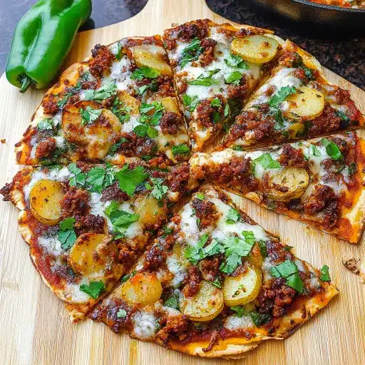 This recipe transforms the classic Spanish tortilla (potato and egg omelet) into a fun, flavorful, and easily customizable skillet pizza. Crispy potatoes and savory chorizo are layered with salsa, cheese, and jalapenos on a crunchy tortilla base, offering a quick and satisfying meal that’s perfect for weeknights or casual get-togethers.