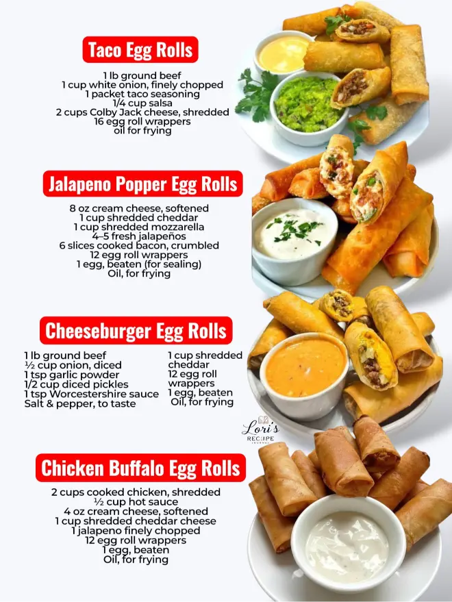 Heat oil to 350°F (175°C). Fry egg rolls in batches 3–4 minutes until golden and crispy. Drain on paper towels.