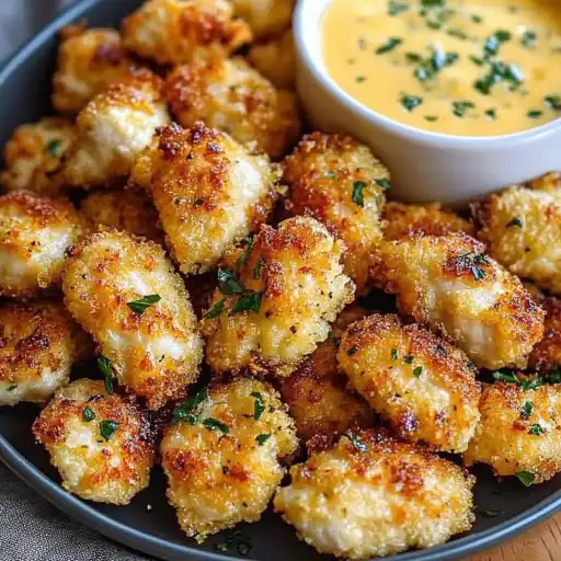 These Crispy Lemon Garlic Butter Chicken Bites are an irresistible appetizer or light meal. Tender, bite-sized chicken pieces are coated in a flavorful blend of lemon zest, garlic, and Parmesan, then baked to golden perfection. Paired with a creamy, sharp cheddar dipping sauce, this recipe is a guaranteed crowd-pleaser for any occasion. The combination of zesty lemon, savory garlic, and rich cheddar creates a symphony of flavors that will leave you craving more. Perfect for parties, game nights, or a fun family dinner!