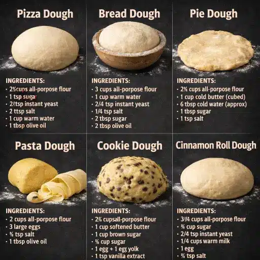Confused about which dough to use? This dough guide for beginners breaks down pizza dough, bread dough, pie dough, pasta dough, cookie dough, and cinnamon roll dough—all in one easy visual. Perfect for home bakers, this cheat sheet shows the basic ingredients for each type of dough so you can bake with confidence. Save this pin for baking basics, from-scratch recipes, and an essential kitchen reference you’ll use again and again!
