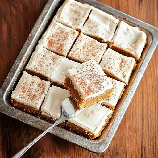 - Once the bars are completely cool, spread the cream cheese frosting evenly over the top. You can use a store-bought cream cheese frosting for convenience or make your own homemade version (recipe below). For a neat finish, you can pipe the frosting using a piping bag fitted with a decorative tip.