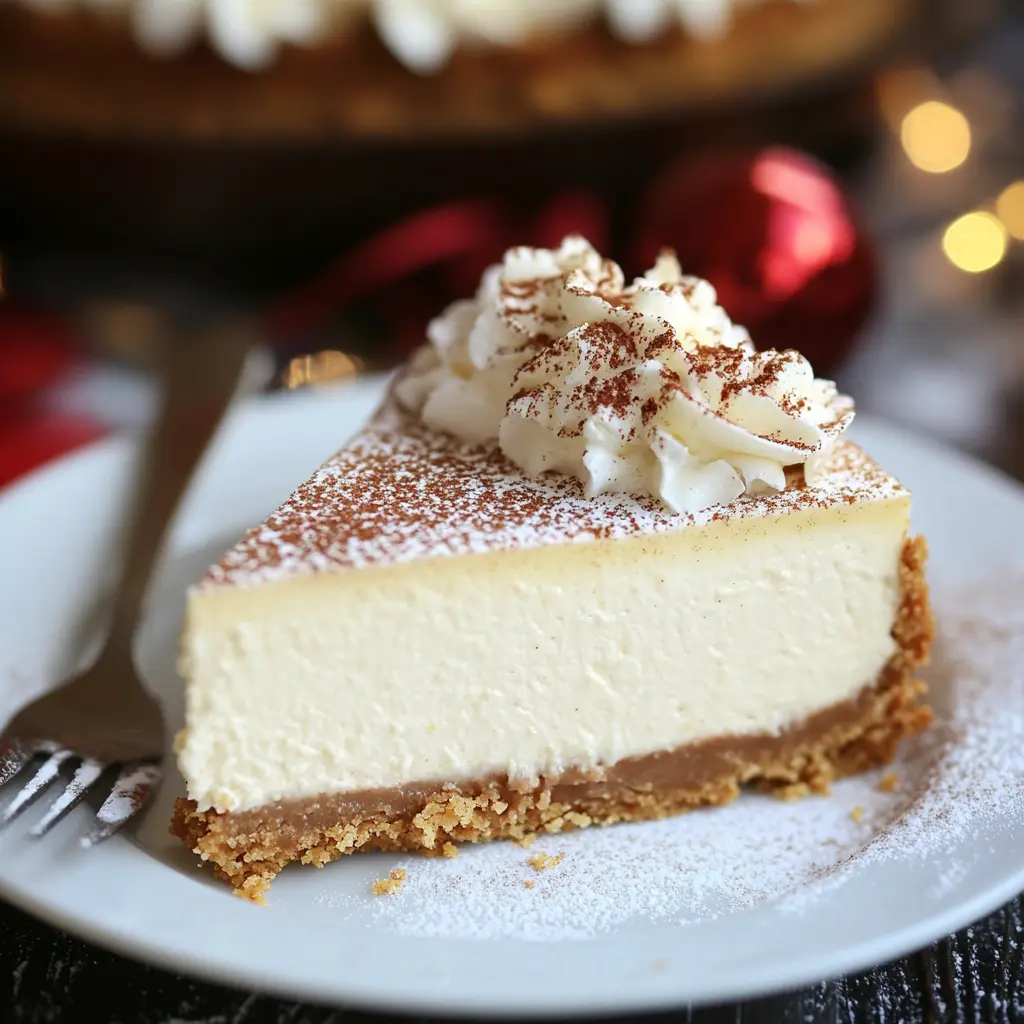Serve this Eggnog Cheesecake chilled, topped with a generous dollop of whipped cream and a sprinkle of extra nutmeg or cinnamon. For an added festive touch, decorate with mini gingerbread men cookies or crushed gingersnaps. Pair it with a glass of eggnog or a warm spiced cider for a truly cozy experience.