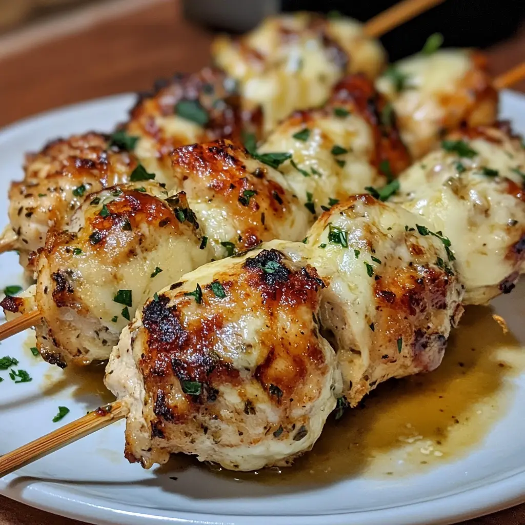 Cheesy Garlic-Stuffed Chicken Bombs on Skewers. These juicy, flavorful chicken skewers are stuffed with fresh mozzarella and seasoned with garlic, herbs, and spices, then grilled or baked to perfection. A delightful and easy-to-make appetizer or main course.