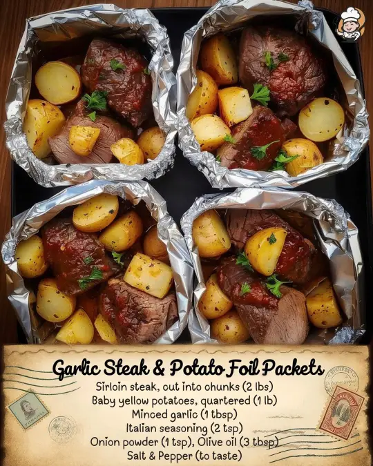 Step 7: Bake or grill. Place the foil packets on a baking sheet and bake in the preheated oven for 30-35 minutes, or until the steak is cooked to your desired doneness and the potatoes are tender. If grilling, place the foil packets on the grill grates and cook for 25-30 minutes, flipping occasionally to ensure even cooking.