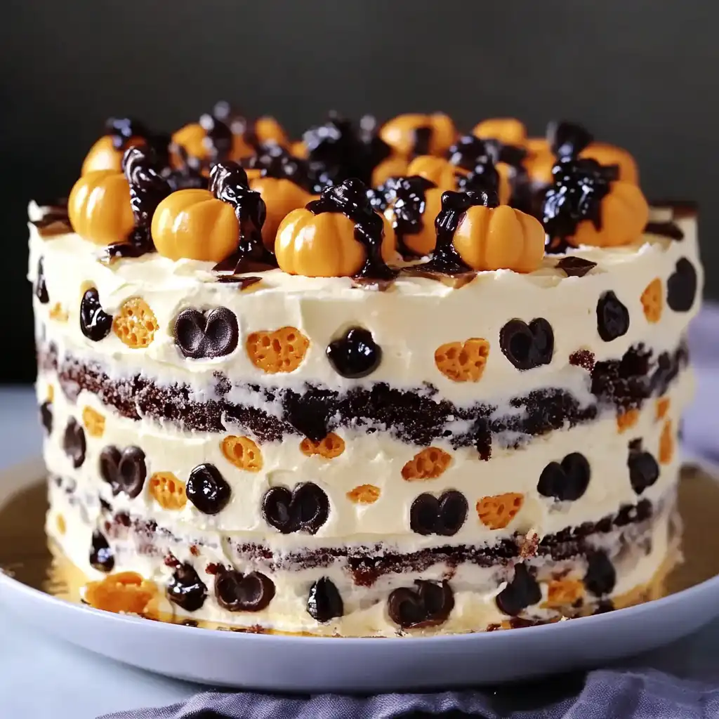 This Halloween Icebox Cake is a festive and easy-to-make dessert that requires no baking! Layers of chocolate sandwich cookies, creamy whipped cream, and rich chocolate ganache create a spooky and delicious treat perfect for Halloween parties.