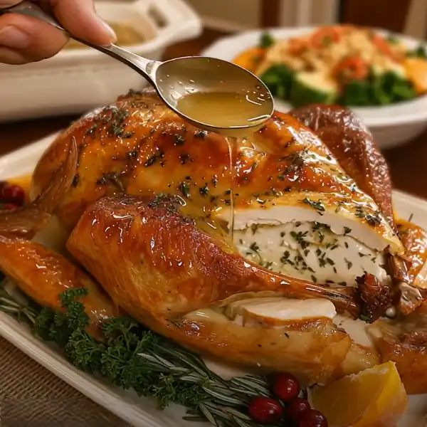 In the last 30 minutes of roasting, mix melted butter, honey, and lemon juice. Brush the glaze over the turkey to create a deep golden sheen. Continue roasting until caramelized and shiny.
