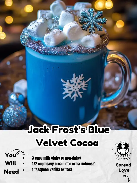 Jack Frost’s Blue Velvet Cocoa is a delightful and enchanting beverage that brings a touch of winter magic to your cup. With its creamy texture, sweet white chocolate flavor, and captivating blue hue, this cocoa is perfect for creating memorable moments during the holiday season. Whether you’re sipping it by the fireplace or serving it at a festive gathering, this recipe is sure to become a beloved tradition. Enjoy the enchantment of winter with every sip!