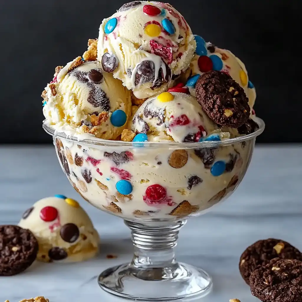 Step 1: In a large mixing bowl, gently fold the softened vanilla ice cream with mini M&M’s, crushed Oreos, chopped chocolate chip cookies, and peanut butter chips until everything is evenly distributed. Be careful not to overmix, as this can melt the ice cream.