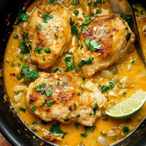 Small Description: This One-Pan Coconut Lime Chicken is a flavorful and easy-to-make dish, perfect for a weeknight dinner. Tender chicken thighs are simmered in a creamy, aromatic coconut milk sauce infused with lime, ginger, garlic, and a hint of spice. Served with fresh herbs, peanuts, and a squeeze of lime, it’s a vibrant and satisfying meal with minimal cleanup.