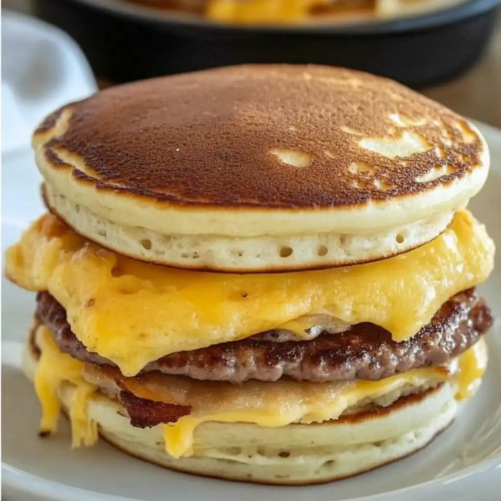 Place one pancake as the base. Add a slice of cheddar, sausage patty, scrambled egg, two slices of bacon, and top with another pancake.