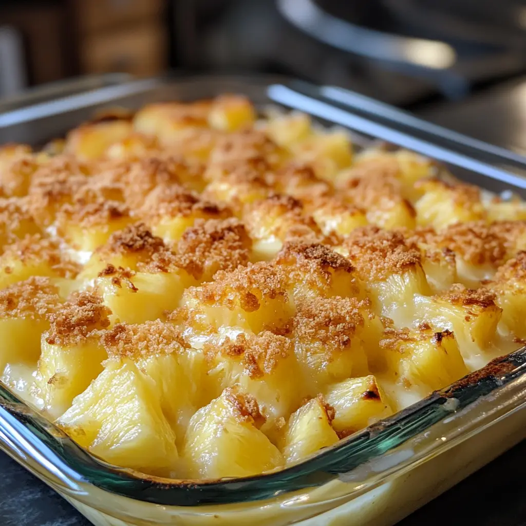Step 6: Bake in the preheated oven for 25-30 minutes, or until the topping is golden and bubbly. The bubbling cheese and caramelized edges will be a clear indicator that your Pineapple Casserole is almost ready!