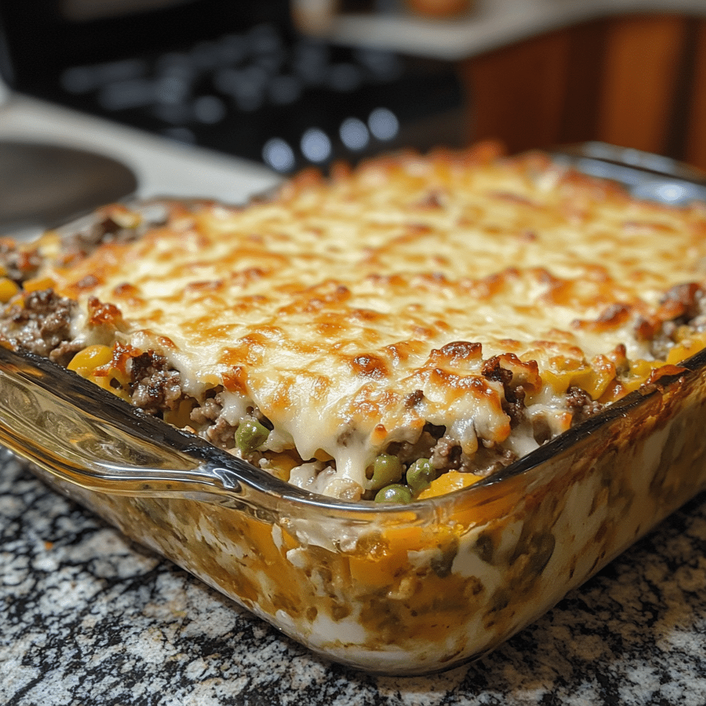 This dish is built upon a foundation of ground beef, blended seamlessly with onions and seasonings that elevate the taste without complicating the process. The secret weapon? A luscious blend of cream of mushroom soup and sour cream enshrouds the layers in a creamy embrace, making every bite a satisfaction. It’s finished off with a generous sprinkle of cheddar cheese, adding an inviting, gooey layer on top that makes it absolutely irresistible.
