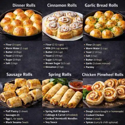 These easy roll recipes cover sweet and savory favorites all in one place. From soft homemade dinner rolls and cinnamon rolls to garlic bread rolls, sausage rolls, crispy spring rolls, and chicken pinwheel rolls, this collection is perfect for family dinners, parties, and holiday meals. Save this pin for bread recipes, appetizer ideas, and crowd-pleasing roll recipes that are simple to make at home.