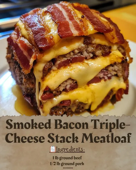 This Smoked Bacon Triple-Cheese Stack Meatloaf is a decadent twist on a classic comfort food. It combines the savory flavors of smoked bacon with a blend of cheddar, mozzarella, and parmesan cheeses, creating a rich and satisfying meal that’s perfect for a family dinner or a special occasion. The meatloaf is moist and flavorful, with a crispy bacon crust and a gooey, cheesy center.