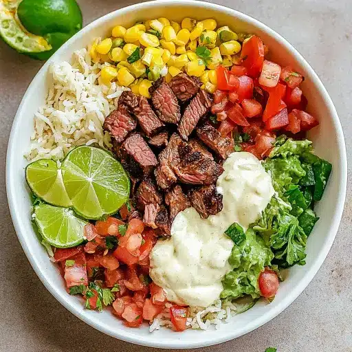 Description: Craving Chipotle but want a healthier, customizable, and budget-friendly option? This Steak Burrito Bowl recipe delivers all the flavor of your favorite fast-casual meal, made with fresh ingredients and tailored to your preferences. Juicy, seasoned steak, fluffy rice (or quinoa), vibrant veggies, and a zesty lime crema come together in a satisfying and nutritious bowl that’s perfect for a weeknight dinner or meal prep.