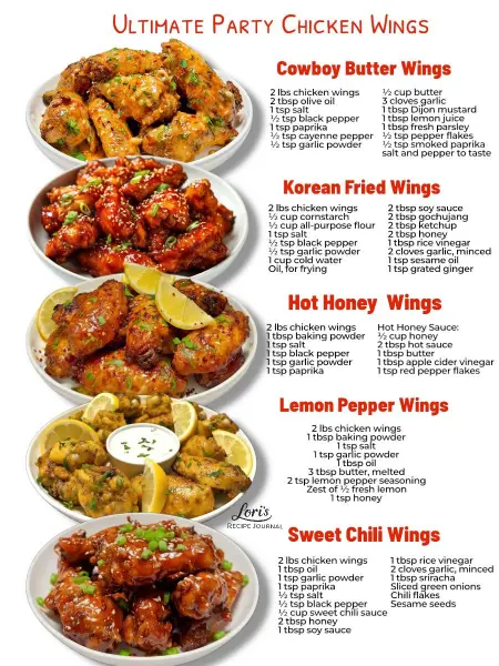 Hosting a party or game day get-together? These ultimate party chicken wings bring bold flavor with every bite! Featuring cowboy butter wings, Korean fried wings, hot honey wings, lemon pepper wings, and sweet chili wings, this wing roundup is perfect for game day, Super Bowl parties, tailgating, and family gatherings. Crispy, saucy, and easy to make—these wing recipes are guaranteed crowd-pleasers. Save this pin for your next party menu or wing night!