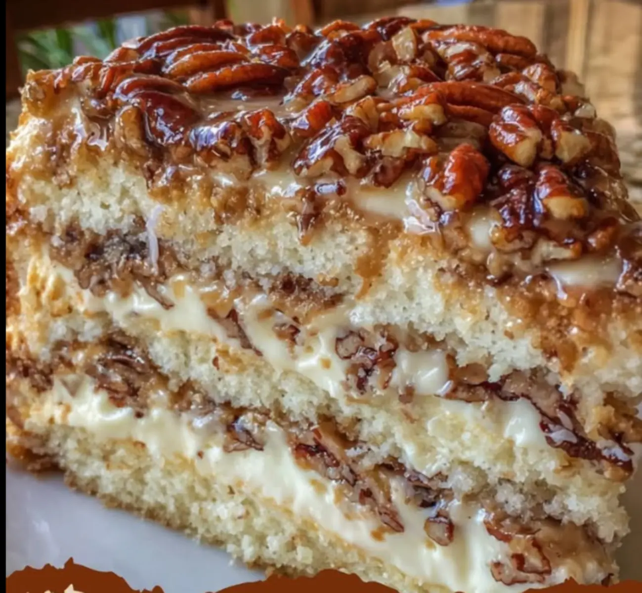 This decadent cake features a creamy cheesecake layer nestled between soft white cake and topped with a rich coconut-pecan frosting—a showstopping dessert perfect for any occasion.